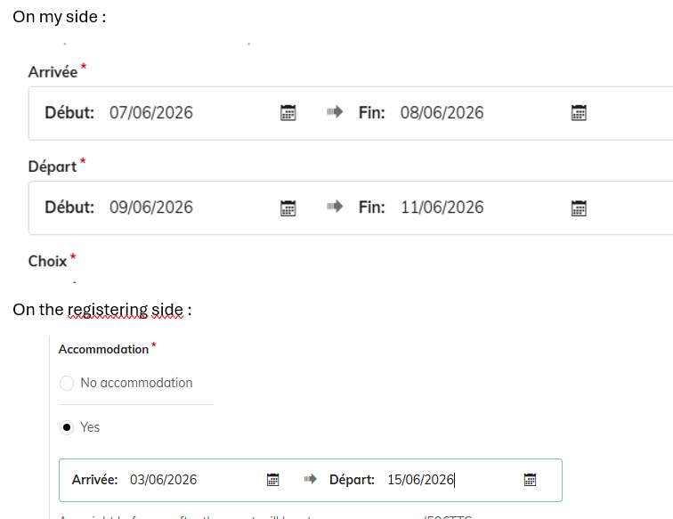 Like here bellow, i want people only to select accomodation between the 7th to the 11th of june, but when I register, if i don’t use the calendar button and tap in directly the date, i can select what i want and validate my registration without nothing telling me i’m not in the right dates