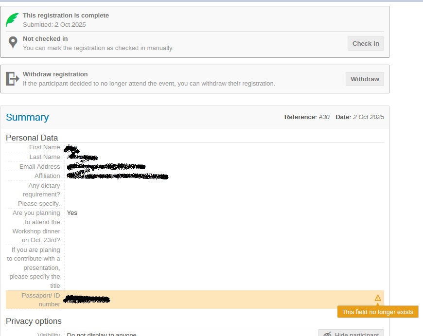 the manager of an event added a mandatory custom field called “Passport / ID Number“ when she created the registration form. During last weeks, the participants registered themselves and informed that field.